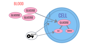 In established insulin-resistance, insulin is released into the blood in response to an increase in blood glucose. But, the insulin doesn’t have the desired effect of reducing the blood sugar effectively, so more insulin is released. The receptors on the cell surface become exhausted by the excess stimulation of insulin and they down-regulate which makes the situation even worse. More insulin stimulates more hunger and more fat storage and more insulin resistance. Another vicious cycle.