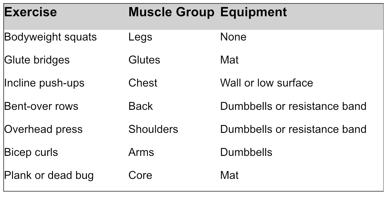 Simple movements like squats, wall push-ups, lunges, and glute bridges build a strong foundation and allow you to gently learn proper form.